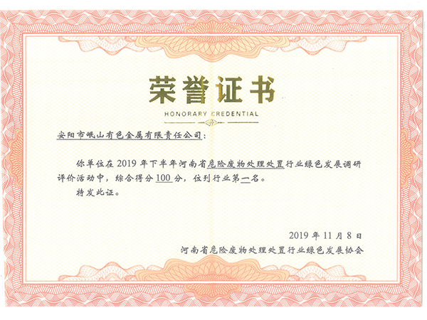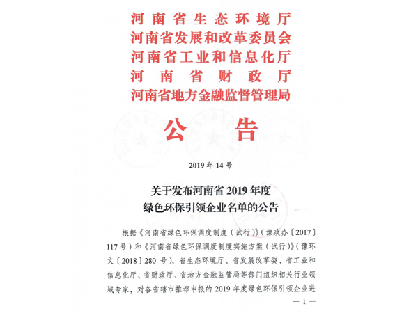 公司获得“河南省2019年度绿色环保引领企业”、“河南省百强企业”、“河南省优秀民营企业行业领军企业” “河南省工业节能减排先进单位”、“河南省循环经济试点企业”等